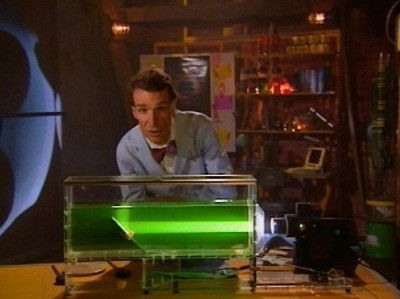 Don't stay in the dark - Bill Nye will help you absorb the science of light optics. Light is energy that normally moves in a straight line, but often something gets in the way. When light runs into something, three things can happen - the light can bounce off, it can go through, or it can be absorbed. Often all three things happen at the same time. Light bounces off mirrors. You see yourself in a mirror when light bounces off your face, into the mirror, and then into your eyes. Light goes through glass. If the glass is bent or curved, the light gets bent on its way out of the glass. The glass in a magnifying glass or a pair of eyeglasses is curved so that it bends light, making things look bigger. More light is absorbed by dark-colored things than by light-colored things. Colors are made when some light is absorbed while other light is bounced back. Black things look black because when light hits them, they absorb almost all of the light.