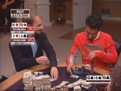 Daniel Negreanu buys in for 1 million and is soon throwing bundles of cash around in an all-out assault on the table.