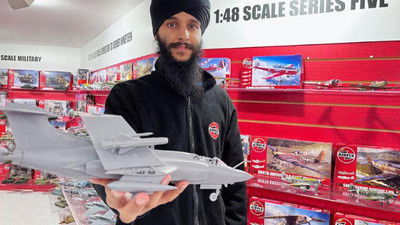 Paramjit works on a Buccaneer fighter jet in 1:48 scale, complete with folding wings, extra armaments and exposed engine bay.