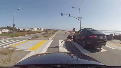 A property manager in California is hit by a car after an altercation with its driver. In Oklahoma, a semi hauling cars gets stuck at a crossing with a train fast approaching. A routine call for two ambulance workers in Chicago is interrupted when a man in a passing car appears to shoot a firearm out the window. A large group of cyclists confront a driver who attempts to weave through a mass bike ride in Houston.