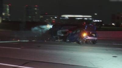 A motorcycle rider on a freeway in L.A. goes head over heels after slamming into stopped traffic.
