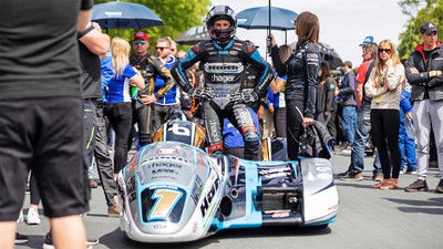 One competitor has a lucky escape from a fiery accident. The Sidecar teams discuss their family connections to the unusual sport.