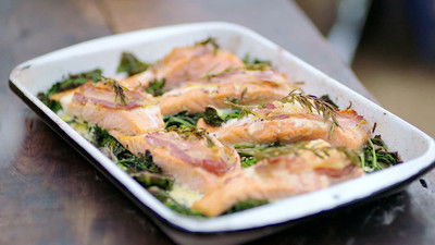 Jamie gives roast chicken a Korean-inspired makeover with a flavour-packed kimchi glaze. He then makes a deliciously simple traybake: salmon stuffed with creamy prawns, wrapped in bacon.