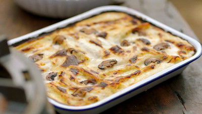 Jamie makes a beautiful cannelloni traybake with mushrooms, layered on a bed of wilted spinach with delicious oozy cheese, to create a satisfying meat-free meal. Later, he whips up delicious garlic prawn kebabs.