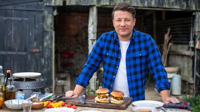Jamie spices up a barbecue chicken burger and demonstrates how to dial down the heat for the little ones. He also shows us how to make delicious homemade hummus and whips up a rocky road with the kids.