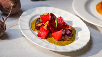 The crockery, glassware and bespoke lamps have arrived at the restaurant building site. Ravneet is perfecting a tangy raspberry souffle with pistachio custard. And Mattie tests out the new kitchen grill with a special burger recipe with homemade sauce.