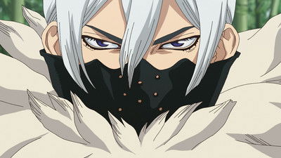 Suika and Ginro work together to rescue the mobile lab from the Perseus. Reunited with Senku and the others, the group works on items to help Kohaku with the selection process.