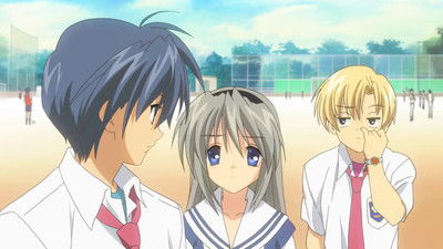During the time that Tomoya is suspended from school, Tomoyo continues to come to his house, wake him up, and make him breakfast, though when she tries to ask him about his relationship with his father, he does not answer her. On Sunday when Tomoyo is making him lunch, Kyou, Ryou, and Kotomi arrive each bringing a bunch of food, and even Fuko appears with food; Tomoya ends up eating everything. Once back at school, he finds out how Tomoyo's reputation is dropping due to rumors of her as a gang leader, and arranges for Tomoyo to compete against several school sports clubs to boost her reputation. After school, Tomoyo tells Tomoya about her family situation and how her brother risked his life to keep their parents from divorcing. Nagisa finally comes back to school and is welcomed by her friends. During a tennis match between Tomoyo and a male tennis club member, a stray ball hits Nagisa on the leg, and Tomoya overprotects her, showing everyone how devoted he is to her.