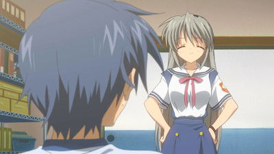 After the previous night's events, Tomoya goes to see if Nagisa is okay, and finds out that she has been physically weak all her life. While walking back from the bakery, Tomoya helps get a strange electrician out of a jam and he gives Tomoya his card, finding his name to be Yusuke Yoshino; Youhei later reveals that Yusuke is a retired professional musician. After school the next day, Tomoya helps Nagisa get more self-confidence for the drama club by acting as a new member of the club asking questions.