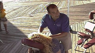 The guys massage beachgoers on the boardwalk, broadcast the news from Times Square, and get their kicks teaching a karate class.