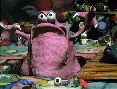 A blue devil comes up from the trap door and starts casting annoying spells on everyone. Boni gets a body and starts making goat noises, Berk changes orange, then red, then grows large, and Drutt continuously changes color.