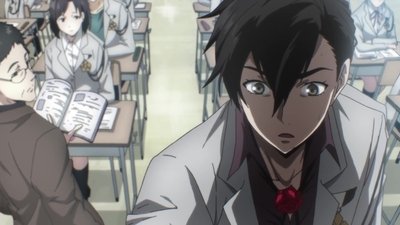 Ritsu is attacked by students taking on strange shapes, but Satake Shogo saves him with a giant handgun. Ritsu is taken aback by the sight of him relentlessly shooting students, but he comes to realize that other people can't see the giant gun or the transformed students. Lost and confused, Ritsu returns to his home where he's greeted by his Mother who's now covered in static and repeating the same exact lines.