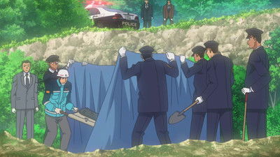 While birdwatching, Conan, Ran, and Kogoro spot a suspicious man driving away from house with a body inside.