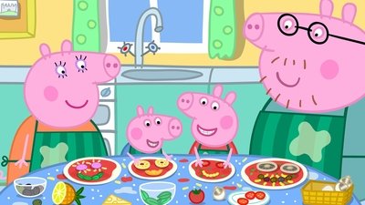 It's almost lunchtime at Peppa Pig's house. Mummy suggest they all make pizza together, they have a lot of fun preparing and mixing up all the food to make their own pizzas - it's all so lovely and messy.