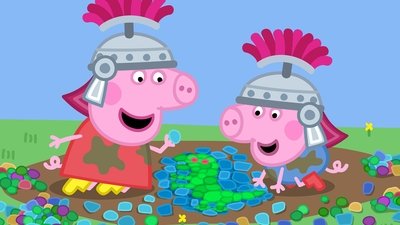 Granny Pig, Peppa and George have fun dressing up as Romans, making a pebble mosaic of a Dinosaur and learn a little Latin too!