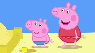 Peppa and her family have fun building a sandcastle at the beach.