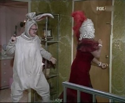 When the Killer Rabbit overhears Louise telling Harry what she saw through the telescope, he follows her to her apartment and waits until everyone leaves to confront her. The Killer Rabbit soon finds that killing Louise is not going to be an easy task with constant interruptions preventing him.