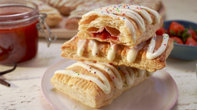 Molly Yeh puts together the coolest kids' brunch in town for Bernie's preschool buddies, and everyone in the family can enjoy! She serves up savory Breakfast Sausage Stuffed Biscuits with runny, sunny-side-up eggs and maple syrup for dunking. Then, she makes Strawberry Vanilla Bean Pastry Pockets drizzled with Cream Cheese Glaze and sprinkles, easy Spinach Egg Bites and Frozen Peanut Butter Drinks the kiddos and parents will both love!