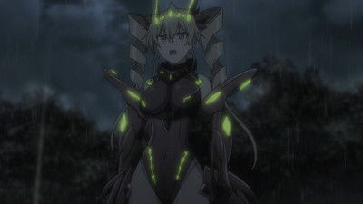 Hayato will experience the first actual battle against Savage in the Zwei Islands. Overwhelmed by the fighting power of Claire, Liddy, and Erica's student organization members, she fights well with Emile. However, the war situation deteriorated in front of the giant species, Trenta-class Savage. Emile tries to protect the downed Liddy, but Savage tears her variable suit apart. There is a bulge in the chest and an old wound under the suit.