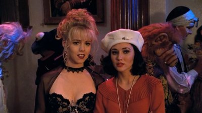 Brenda, Dylan, Steve, Donna and Kelly attend a Halloween party. Donna dresses as a mermaid; but her fins inhibit dancing, walking, and trips to the bathroom. Kelly's seductive costume catches the eye of a college student. She goes upstairs to talk with him, then becomes uncomfortable. The guy accuses her of leading him on and tries to rape her. Brenda and Donna enter in the nick of time, and Steve punches out the guy. Brandon stays home to hand out candy (actually raisins), but Emily comes to the door with her niece and nephew. Brandon joins them for trick-or-treating, but he and Emily get caught up in their conversation and temporarily lose the kids. David blows off the party and finds Scott hiding out in the bushes. They reminisce about the old days while waiting for an egg fight that never materializes.