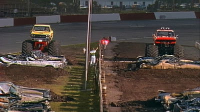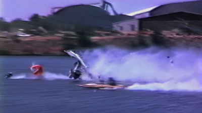 Phoenix, AZ – during the qualifying round of the hydro racing world finals Scott Lumbert races a yellow boat, it spins, flies up, rips apart and his capsule flies onto land and keeps bouncing along the ground end over end many times, then stops in the water.