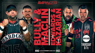 This week's edition of IMPACT! from Toronto, Canada features a tag team showdown pitting the all-Canadian duo of Josh Alexander & PCO against Bully Ray & Steve Maclin. The official contract signing will take place for Trinity's upcoming Knockouts title defense against Alisha Edwards. Deonna Purrazzo squares off with Dani Luna. Former Tag Team Champions Subculture battle the team of Rich Swann & Sami Callihan. X-Division Champion Lio Rush goes one-on-one with Kevin Knight.