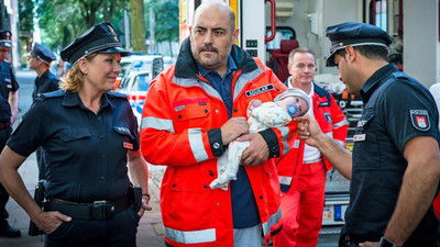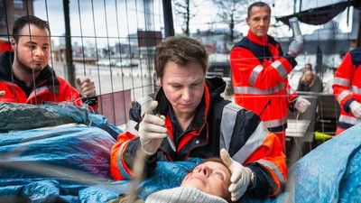 Shows the interaction between Hamburg police officers and paramedics.