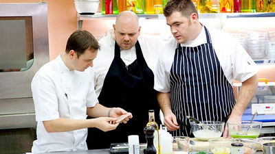 Chefs battle to cook at an Olympic banquet. Northern Ireland's Chris Fearon, Chris Bell and Niall McKenna submit their starters to judge Richard Corrigan.
