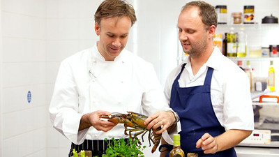 Chefs battle for the chance to cook an Olympic banquet. Scots Alan Murchison, Colin Buchan and Mark Greenaway cook their fish course, including crab and mackerel.