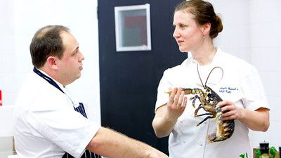 Chefs battle for the chance to cook a banquet at the Olympics. Richard Davies, James Sommerin and Stephen Terry cook their fish course, including poached lobster.