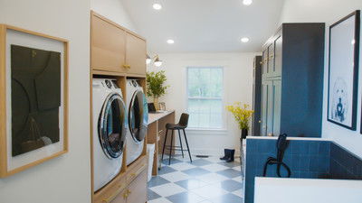 Brooke and Brice renovate a mudroom, laundry room and pantry space for a family of four and their four-legged friends. As a fun surprise, Brooke and Brice add a wash station in the mud room for the dogs.