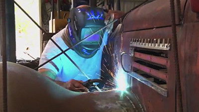 Car builder Ian Roussel delivers the fabrication goods as he transplants an old 1948’ Cab onto a modern Roll-Off Truck and then combines them to build one “Bad” Trash Truck.
