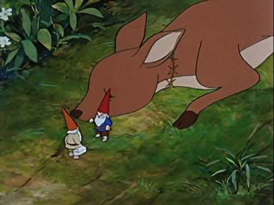 David explains how gnomes build their houses. The entrance of the house is under a tree, with an underground tunnel leading to another tree. Many other gnomes and animals help build the houses. David and Lisa get a message from a rabbit about a deer with a broken leg. They both go to help the deer, who had fallen on a sharp rock, and part of it was embedded in her leg. David removes the piece of rock and puts a splint made of branches on her leg. Later that night, David also has to remove pine cones from the throat of another deer.
