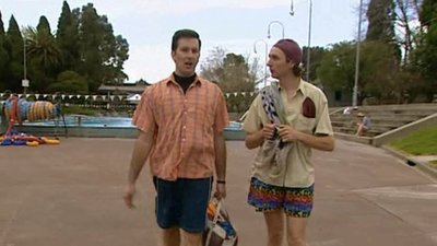 Frank is afraid of the water, because he can't swim. So Colin takes him to the big outdoor swimming pool for a beginners swim class. Then Frank drowns, and has to be rescued by a pretty female lifeguard, who gives him the kiss of life. He gets the wrong idea and sets out to impress the lifeguard, not realising her husband is a former Olympic swimmer, now only known from the "Penguin Muffler" ads he appears in.