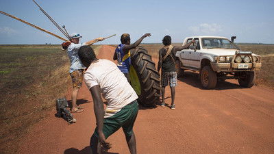 Stranded without food or water the boys push the tractor wheel towards the outstation...and tractor. Miraculously they find a spring and eventually reach the outstation.