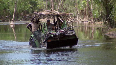 With a charged battery and some brutal bush mechanics the tractor sparks up and is loaded with handy items and an old broken postie motorbike. The boys pile on and take off only to be halted by a massive brown river.