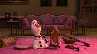 Olaf sits on the floor playing a clarinet. He gets distracted by a drum, a cymbal and a trumpet. He has his feet play the percussion while the trumpet is in his nose and proceeds to play all four instruments to the tune of "Old McDonald".