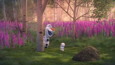 Olaf is asleep under a tree. A butterfly briefly disturbs him, and he utters "lollipops and gumdrops" before snoozing again.