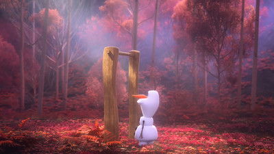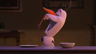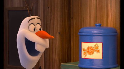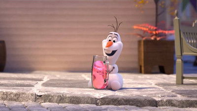 Olaf sits down with a pitcher of pink lemonade. After drinking the whole container, his body turns pink. He excitedly tells Anna, who is off screen, that he is a snow cone.