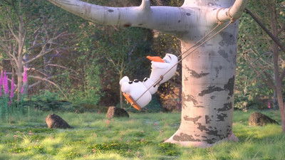Olaf is using a swing when suddenly his nose gets embedded into a tree branch. His body parts fall down one by one and he excitedly decides to do the trick again.
