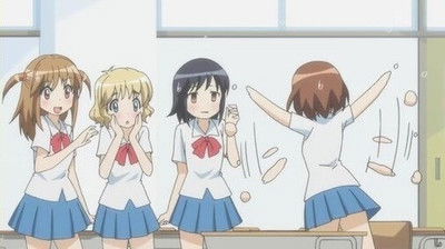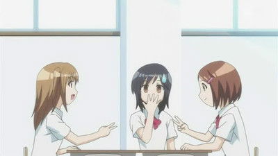A pair of boys, along with a girl with glasses, make delusional observations of Mayu and friends